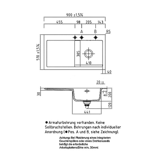 - Maße der Spüle: 90 x 51 cm (B x T)