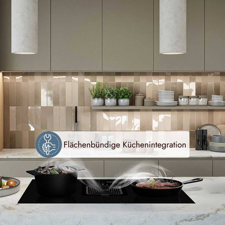 Ein Muldenlüfter ist direkt in die Kochfeldoberfläche integriert und bietet eine diskrete und effiziente Lösung zur Entfernung von Kochdünsten direkt an der Quelle. Im Gegensatz zu traditionellen Dunstabzugshauben oder Tischhauben, die über oder neben dem Kochbereich angebracht sind, ermöglicht der Muldenlüfter während des Kochens eine klare Sicht und Bewegungsfreiheit beim, da er flächenbündig mit der Arbeitsplatte abschließt.