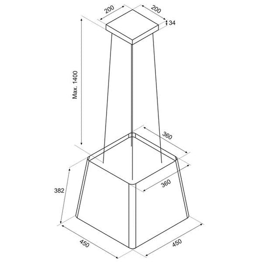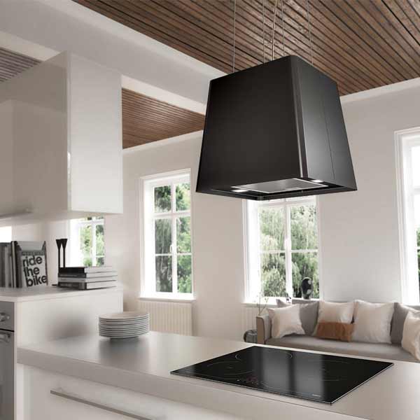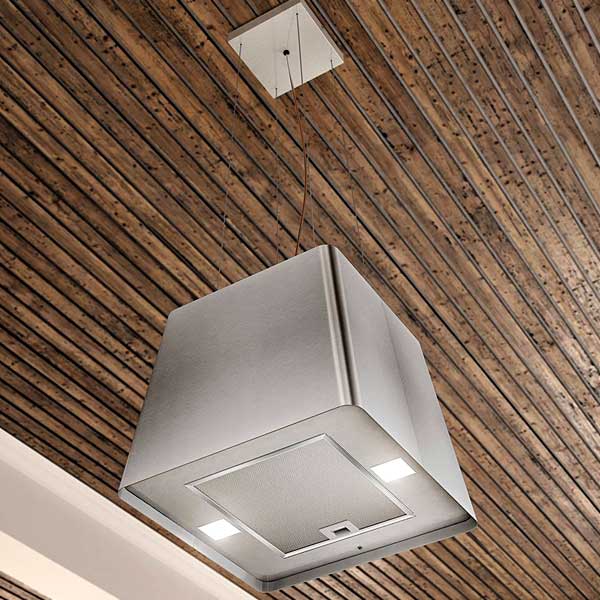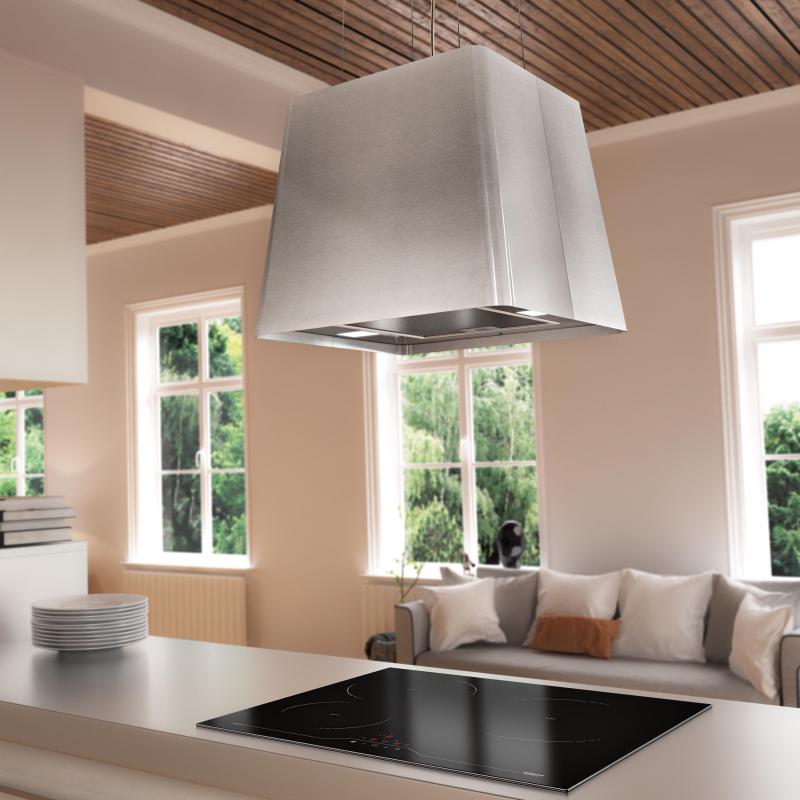 Die Airforce Seppio Inselhaube schwebt elegant an Stahlseilen und bringt mit ihrem matten Edelstahl-Look schlichte Eleganz in Ihre Küche.