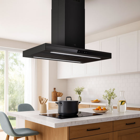 Die Elica Adéle Island besticht durch ihr klares Design aus schwarzem Glas und Edelstahl und bringt mit 90 cm Breite Eleganz auf jede Kochinsel. Ihr modernes Erscheinungsbild fügt sich nahtlos sowohl in puristische Küchen als auch in wohnlich gestaltete Raumkonzepte ein. Gleichzeitig überzeugt die Inselhaube mit starker Funktionalität: Bis zu 770 m³/h sorgen zuverlässig für frische Luft, auch in offenen Wohnküchen. Mit Energieeffizienzklasse A arbeitet sie sparsam und nachhaltig. Für alle, die Wert auf Beständigkeit, Technik und Komfort legen, ist die Adéle Island eine sichere Wahl.