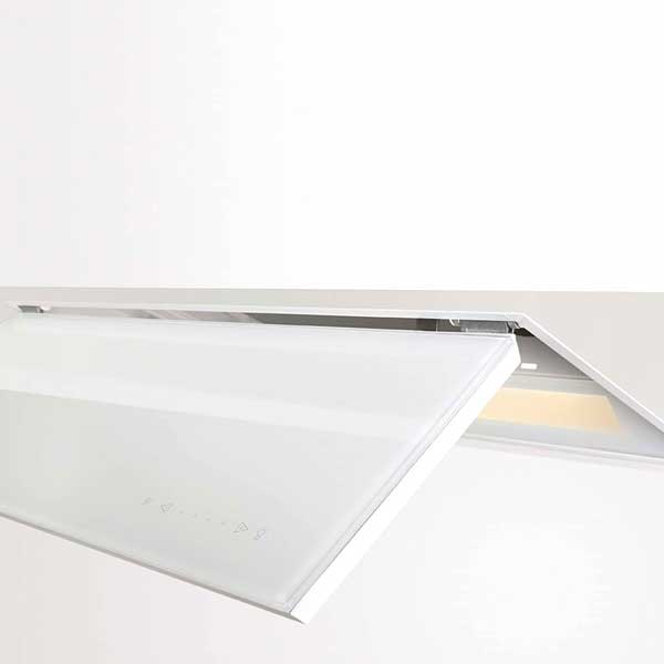 Mit der Fusion Schrankhaube von Novy wurde eine formschöne Dunstabzugshaube mit starken Funktionen geschaffen. Bei geschlossenem Schrank ist die Haube damit unsichtbar. Wird die Dunstabzugshaube benötigt, kann sie durch einfaches herausziehen der Glasblende gestartet werden. Mit der Oberfläche aus Hartglas ist die Blende durchsichtig, und damit kann auch leicht von oben auf das Kochfeld geschaut werden. Durch die Berührungselektronikschaltung mit LED Anzeige ist ein genaues Einstellen der Leistung gut möglich. Sie hat 3 Effektivstufen und eine extra Intensivstufe, die genutzt wird, wenn große Menge an Kochdünste aufsteigen.