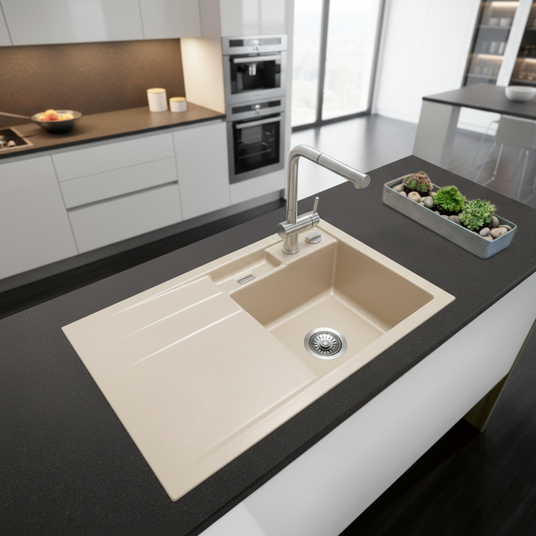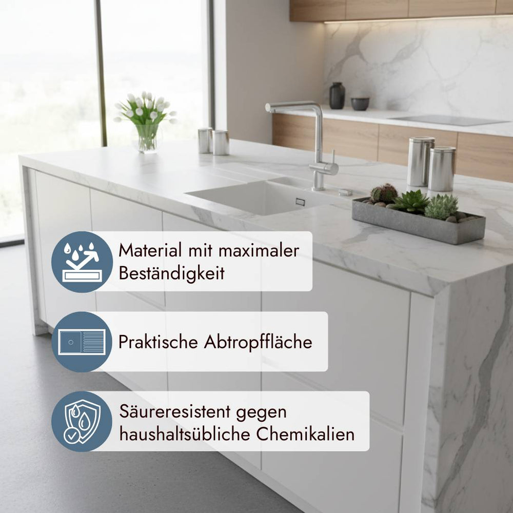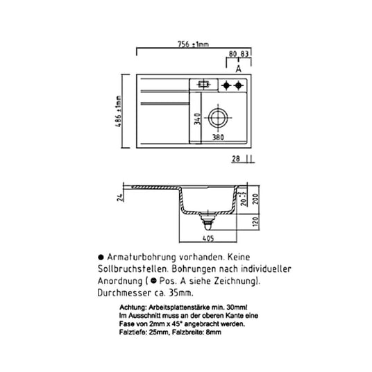- Maße der Spüle: 75,6 x 48,6 cm (B x T)