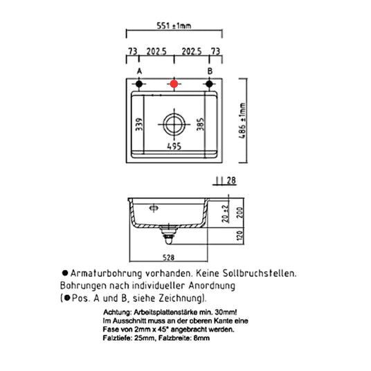 - Maße der Spüle: 55,1 cm x 48,6 cm (B x T)