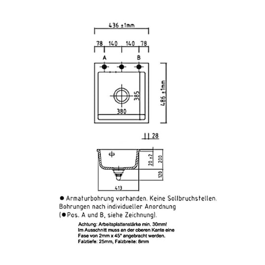 - Maße der Spüle: 43,6 cm x 48,6 cm (B x T)