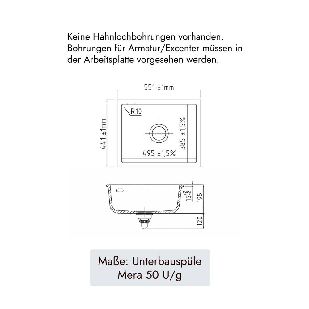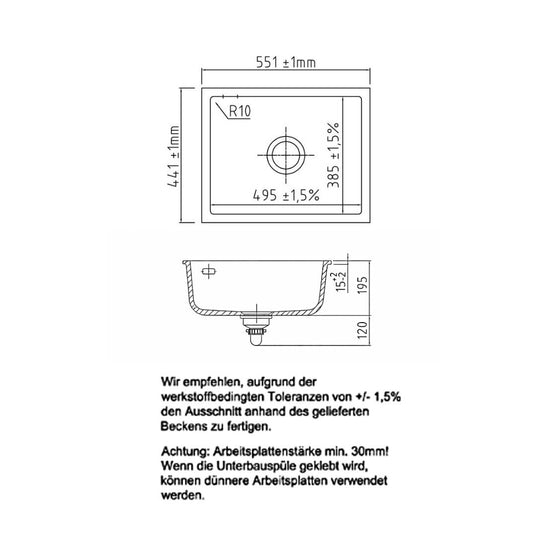 - Maße der Spüle: 55,1 x 44,1 cm (B x T)