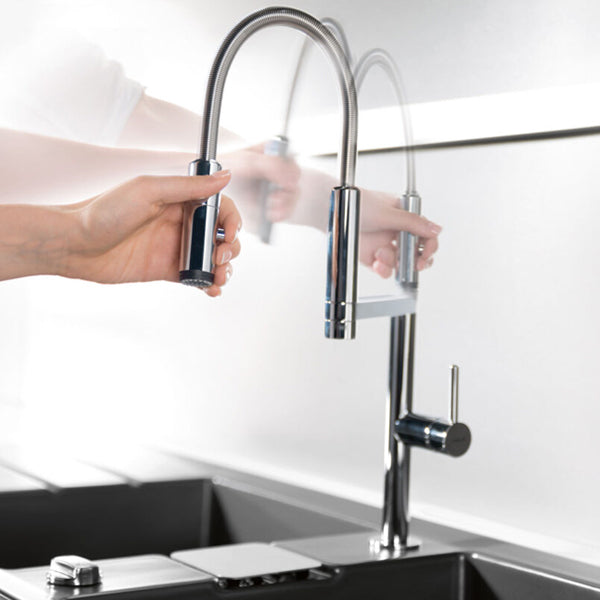 Die Move Küchenarmatur von Systemceram kombiniert modernes Gastro-Design mit maximaler Funktionalität. Dank des flexiblen Schlauchauslaufs und der innovativen Magnet-Halterung genießt du volle Bewegungsfreiheit beim Spülen und Befüllen. Die zusätzliche Auslaufmöglichkeit bietet noch mehr Komfort für den täglichen Einsatz.