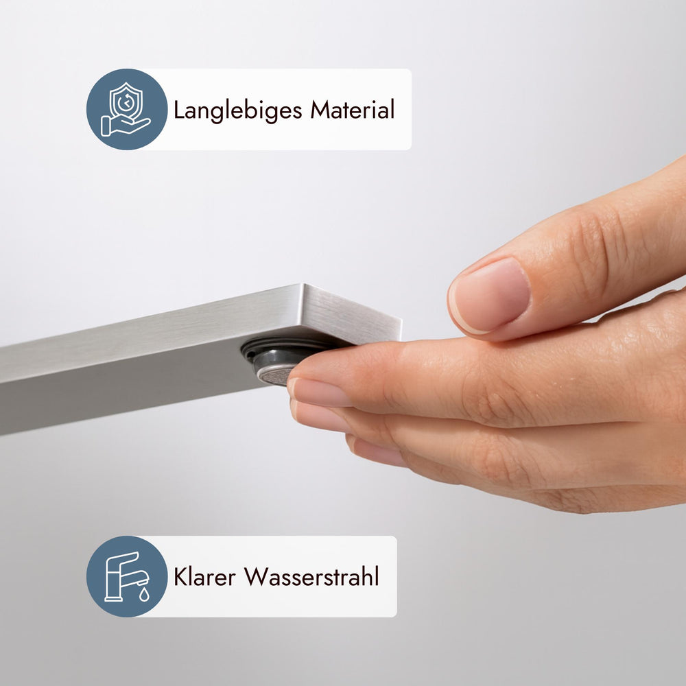 Inklusive: 1 x Armatur, 1 x Anschlussschlauchset, 1 x Befestigungssatz, 1 x Montageanleitung, 1 x Pflegehinweis