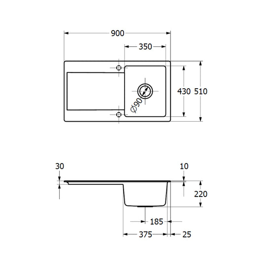 - Maße der Spüle: 90 x 51 cm (B x T)